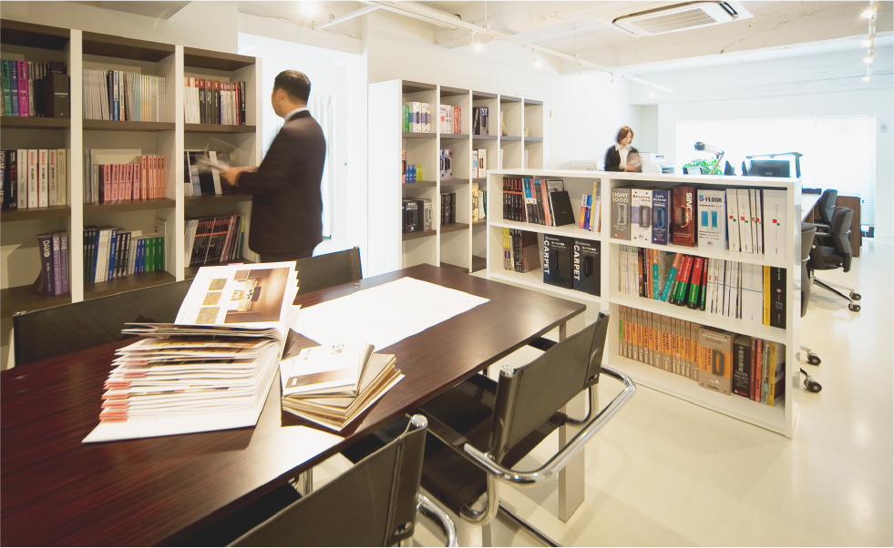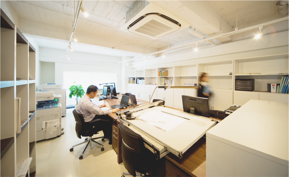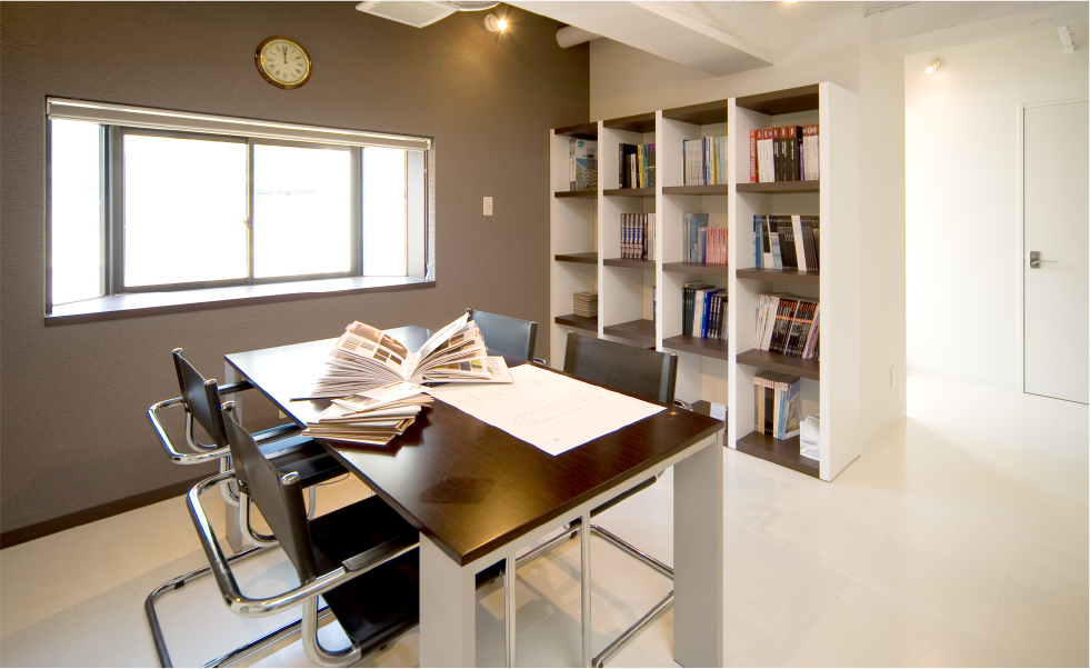 会社設立に伴うオフィス計画をサポートしました。建築設計の仕事柄、膨大な資料・カタログを機能的に収納する壁面家具などをオリジナル製作。また、不動産の契約実務などに活用する会議室は、白を基調に濃色ソファでコーディネートしました。会社設立、つまりゼロからのスタートのため、会社名の提案およびロゴマークデザインから、OA機器の手配・リース契約段取り、電話・パソコンの手配とLAN工事、名刺・封筒などの企業ツール・営業ツールおよびホームページまで、ほぼフルサポートのオフィス実例です。