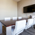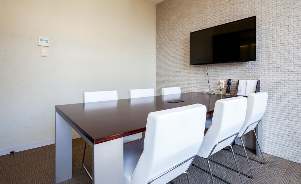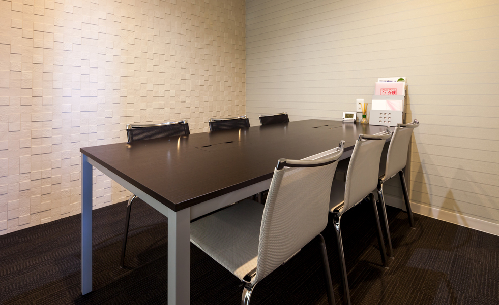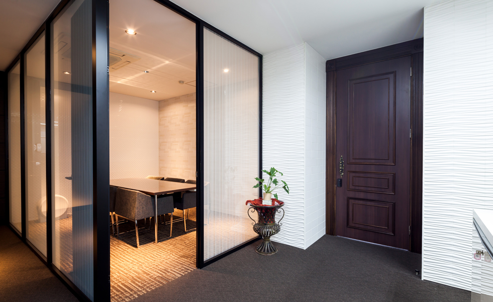 迎賓・高級・重厚をキーワードにオフィスをデザイン。木調の両開きの扉を開けた先にあるエントランスは、ツヤとマットの質感違いで表情に変化が出るブラックタイルを貼り、オリジナリティを追求しました。商談室やミーティングルームは、壁面タイル貼りやクロス貼り分けを部分的に採用し、立体感のある空間イメージに。ガラス部分にはフィルムを貼り、視線が気にならないように配慮しています。全体的に、石やタイルを中心として、ツヤの有無や凹凸だったり、表面が波打っていたりと、さまざまな表情が楽しめる素材を意識して多用しました。