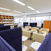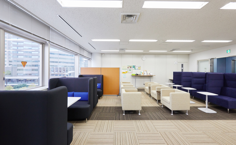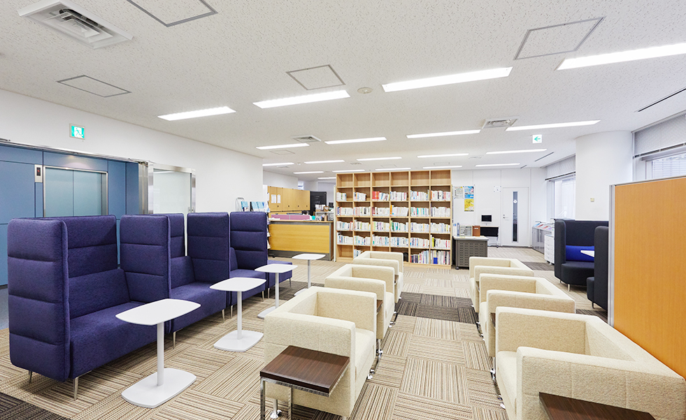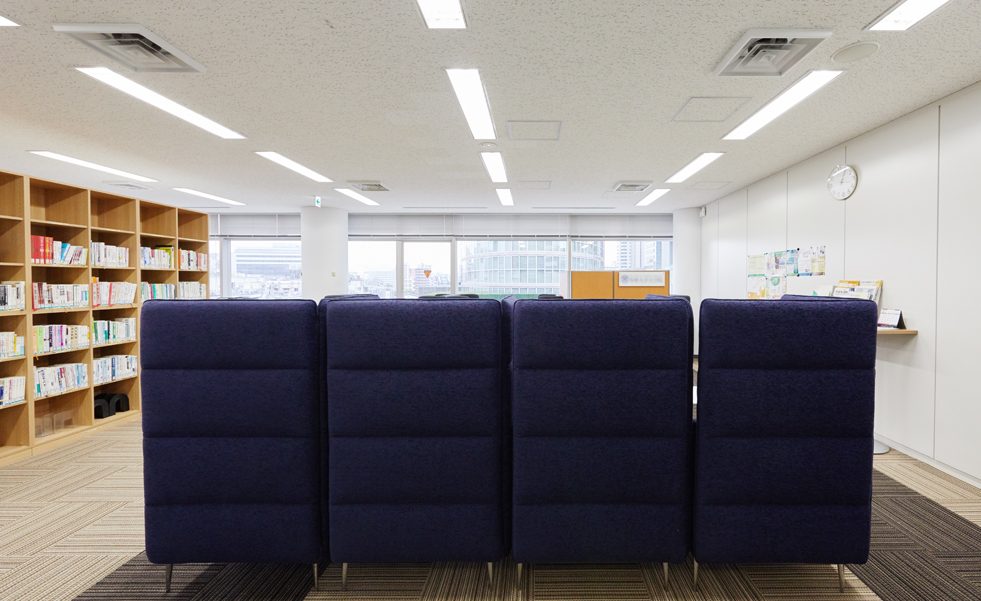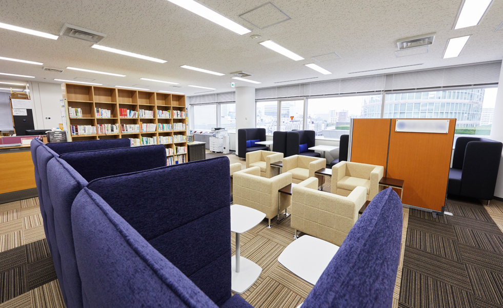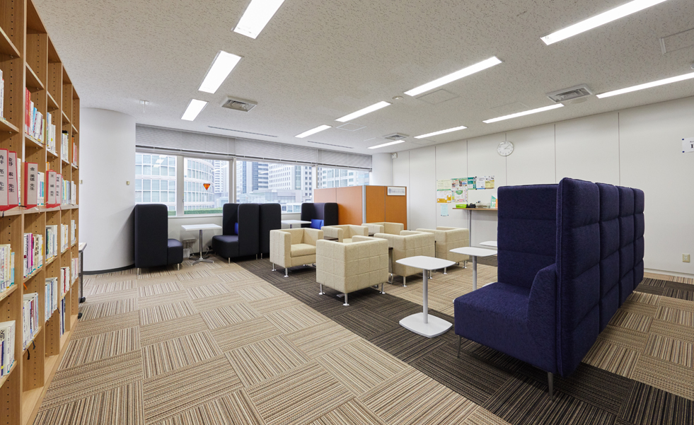 主に社会人スクールとして使われているフロア(大学のサテライト施設内)のラウンジスペースのリニューアルです。「空港のラウンジ」をコンセプトに、リラックスできる雰囲気と、ここから新しいことが生まれていくイメージづくりを展開。ミーティングスペース・複数人スペース・個人スペースの3つの機能を、背もたれの高いハイバックソファでゾーニングしつつ、人と人とのつながりが生まれる開放的な空間へと生まれ変わらせました。たくさんの書籍を収納できる本棚も新調。床面を2種類のカーペットで張り分けるデザインとするとともに、人の動線に考慮し、通路にゆとりを持たせたことでラウンジ感を一層高めています。