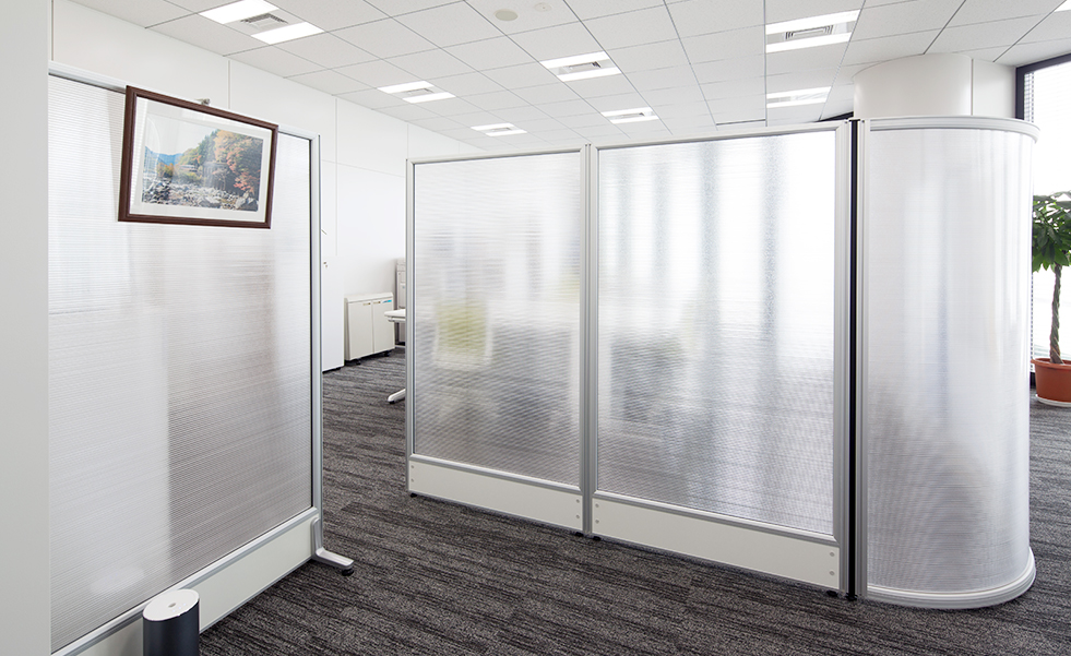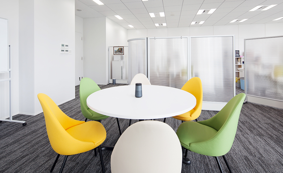 オフィス移転に伴うレイアウトと家具セレクトを提案させていただきました。打ち合わせスペースでは、ころんとした形が可愛らしいカラフルなチェアが空間を彩ります。間仕切には半透明のパーテーションを使用し、圧迫感を解消。執務スペースは、清潔感のある白のデスクにグリーンのオフィスチェアを合わせることで、明るく爽やかなイメージを実現しています。