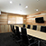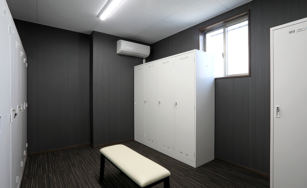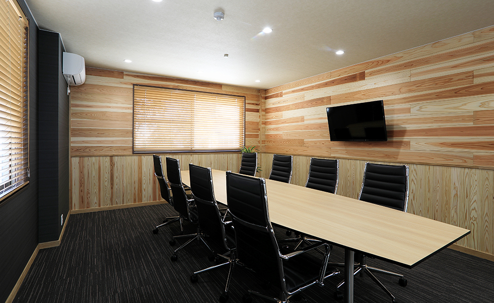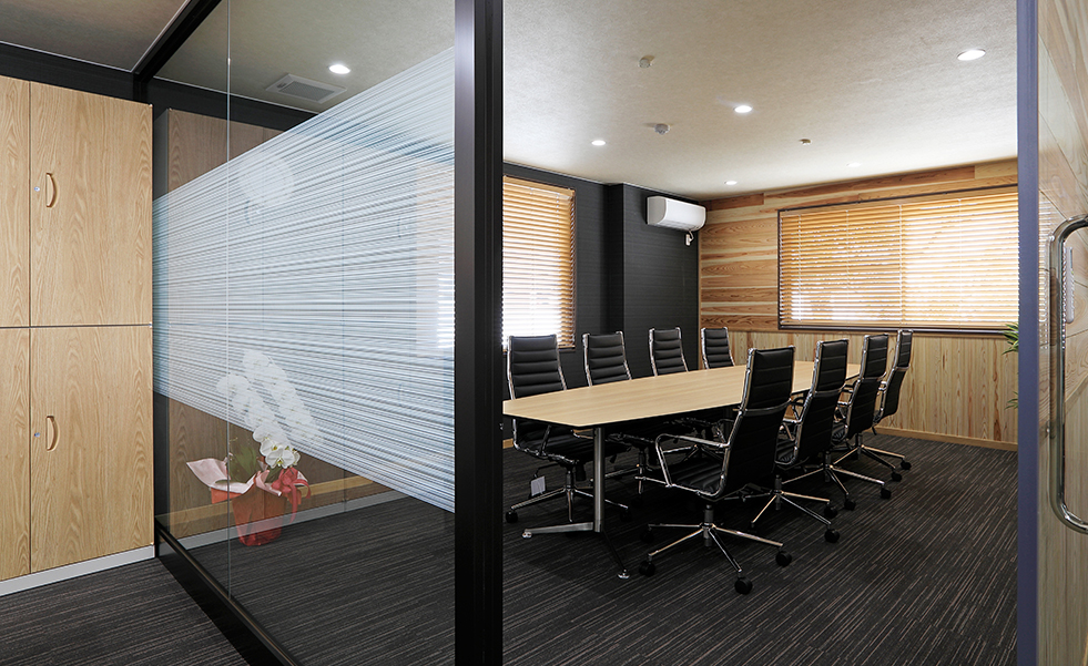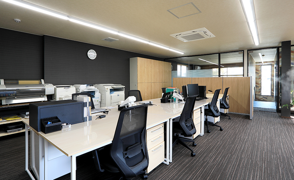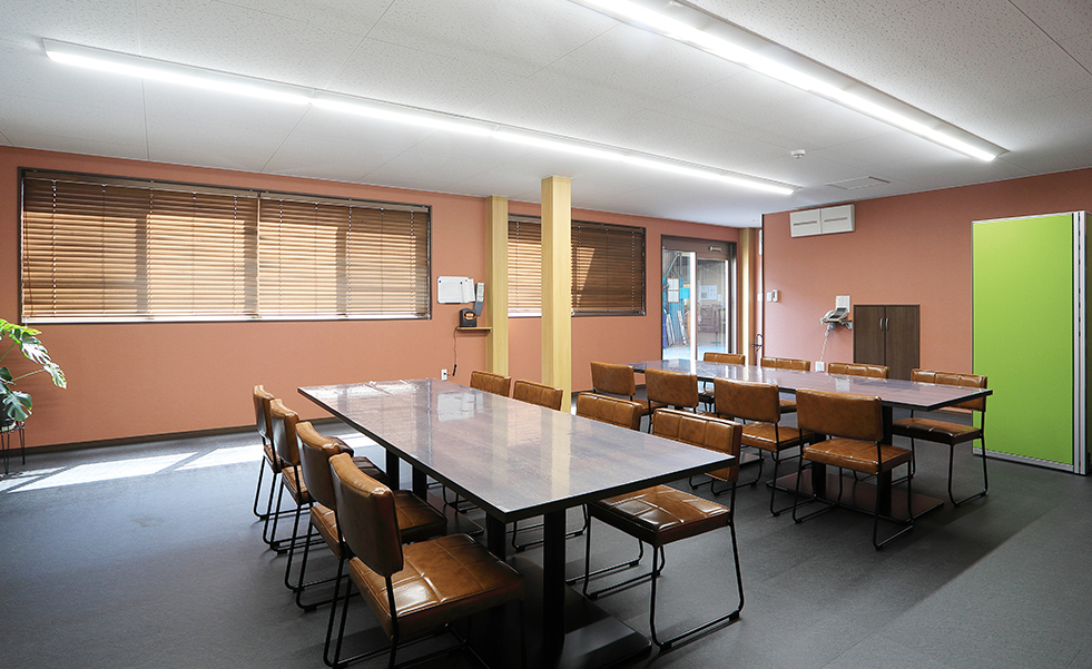 工場に隣接する2階建ての建物で、1階は食堂、2階はオフィス&応接スペースとなっています。食堂は、「座り心地が良く、かつ汚れにくい椅子を」というオーダーを受けて、クッション性が高く、汚れても簡単にお手入れできるフェイクレザーの椅子をセレクトしました。また、テーブルは4人用のものを複数組み合わせ、椅子はスタッキング可能なタイプのため、レイアウトの変更がしやすくなっています。ロッカーが並ぶ更衣室も設けました。ダークブラウン系のカラーで全体をまとめた1階に対して、2階はナチュラル系のカラーをベースに、木目とブラックでメリハリのある空間に。オフィスの奥に透明パーテーションで区切られた応接スペースには、特注の木目天板を使用した、8人が座れる大きな応接テーブル。ナチュラルな木目とブラックレザーの組み合わせで、お客様が理想としていた“カッコイイ空間”を実現しました。