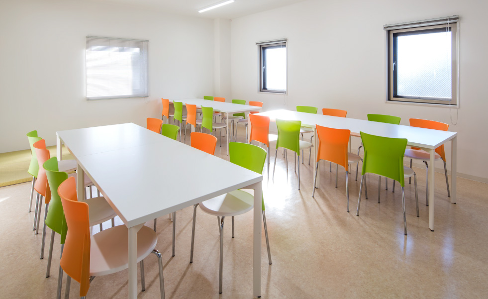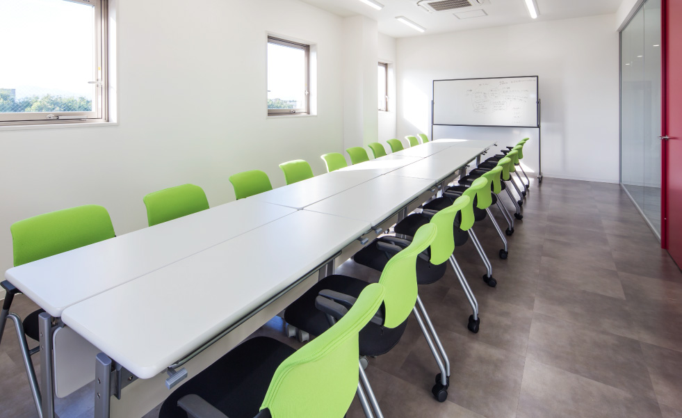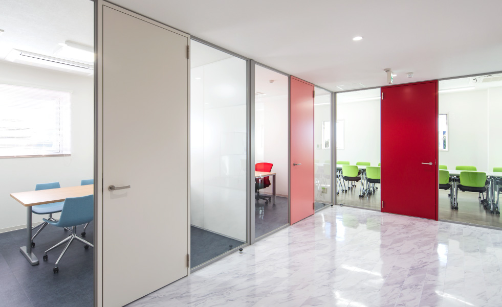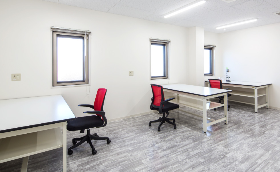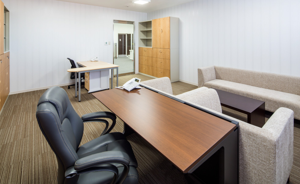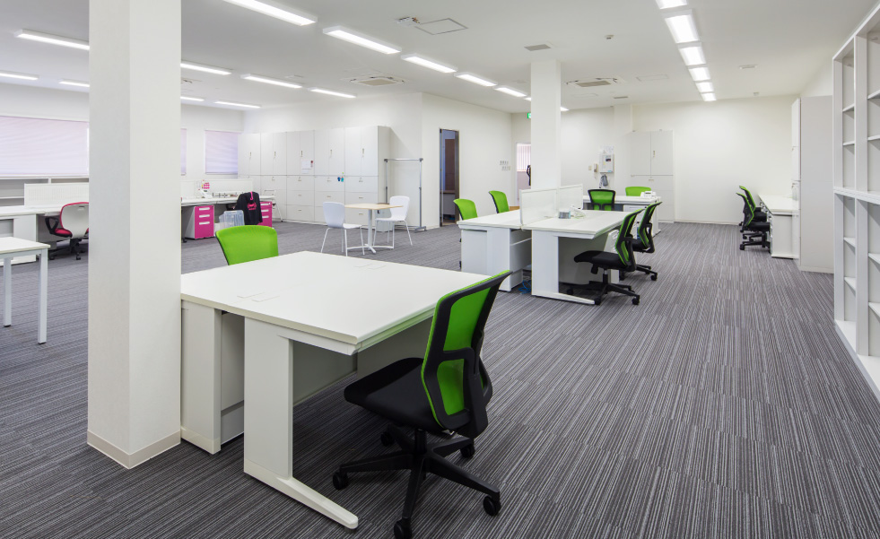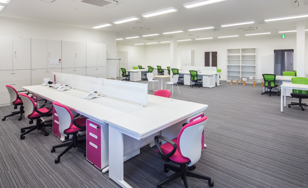 ドレス関連を扱うオフィスのデザイン・レイアウトおよび家具のコーディネートです。服の採寸や商品の梱包など専門的で立ち仕事が多いため、作業台の高さや棚板の配置などに配慮しました。また、各部署ごとに多めの収納キャピネットを設置したことで、すっきりとした空間を維持できるようにしています。打ち合わせスペースは空間の分割を意識し、それぞれ違う雰囲気に。「女性が多い部署にはピンク色をとりいれたい」というご要望には、ほどよく主張するピンクのワゴンとワークチェアをセレクト。社長室は木目の家具をコーディネートし、落ち着いた空間となっています。1階には食堂があり、白を多く取り入れたビタミンカラーにすることで明るさと清潔感を重視しました。