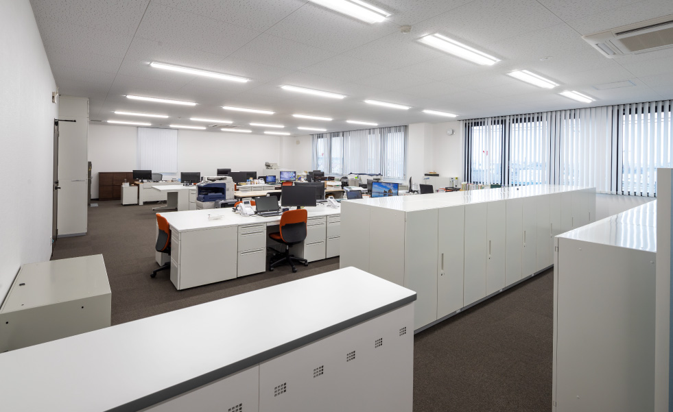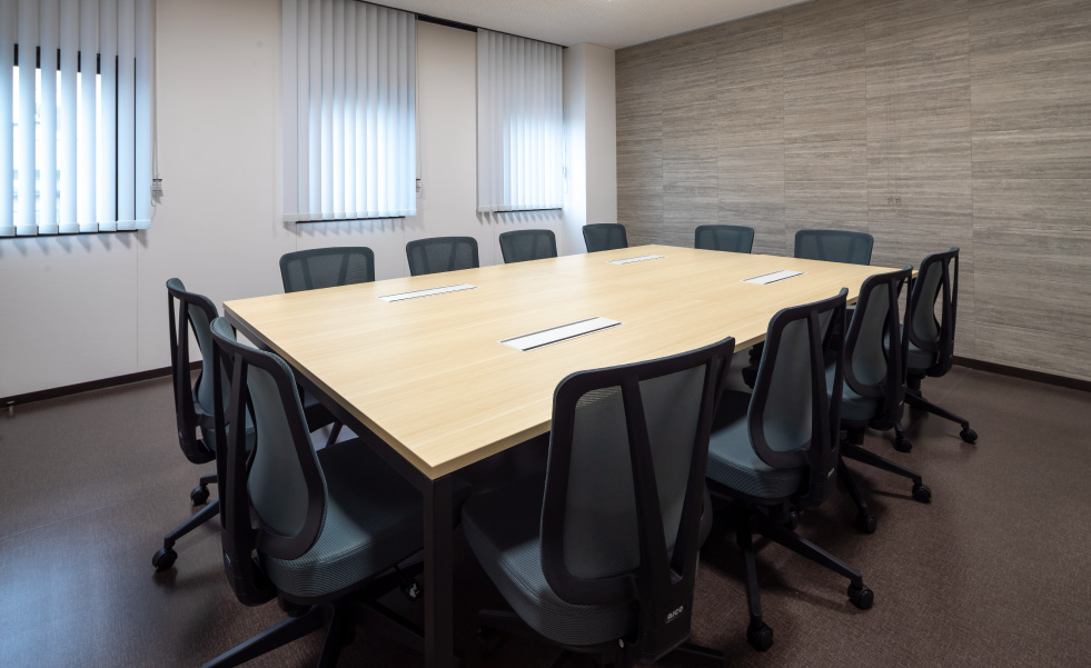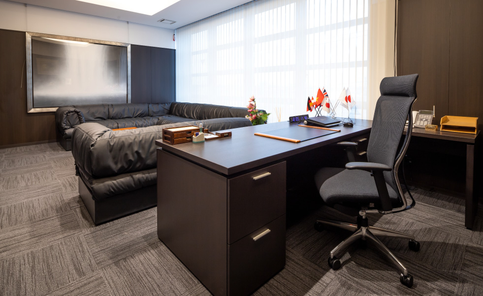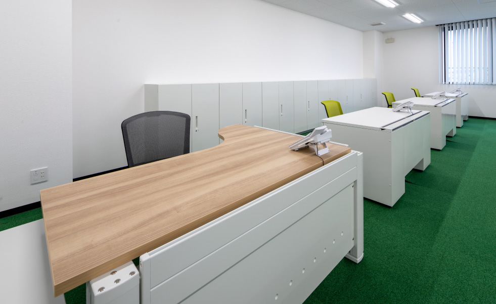 新社屋(3階建て)の新築に伴う、全フロアのオフィスレイアウト・家具コーディネートをご依頼いただきました。ワークスペースについては、行き来がしやすいように席の間隔を広めに取り、部署ごとにチェアのカラーリングを変えることでエリア分けするとともに、他部署との交流がしやすいよう、中央付近に作業テーブルなどを配置。より働きやすいレイアウトを心がけました。旧社屋から移設する家具もあったため雑多な印象にならないよう、清潔感のある白と明るい木目を基調に家具をコーディネート。各会議室のテーブルは、デジタル機器を用いた効率的な会議ができるよう、コンセント内蔵型や配線スペースがあるタイプをセレクトしています。社長室・応接室・役員室などはガラリと雰囲気を変え、ブラックやダークブラウンを基調としたシックで高級感のあるデザインとなっています。