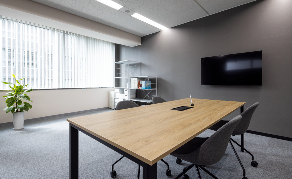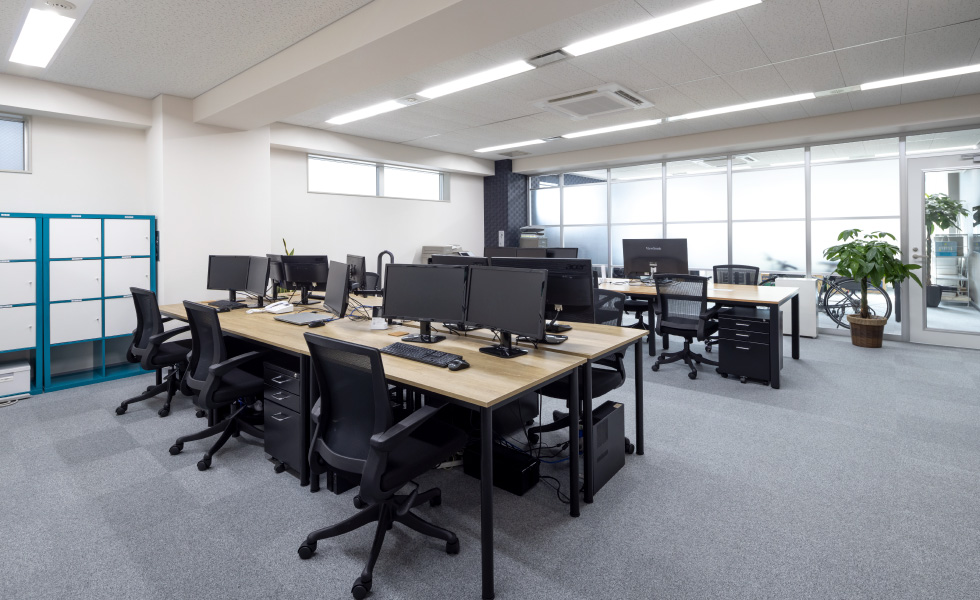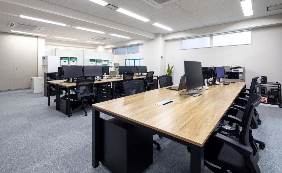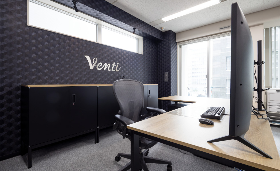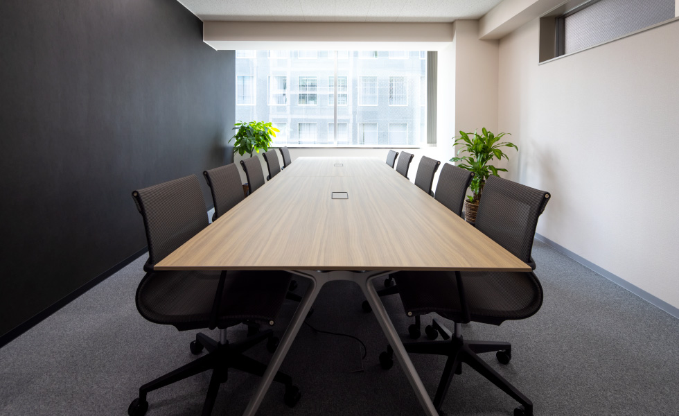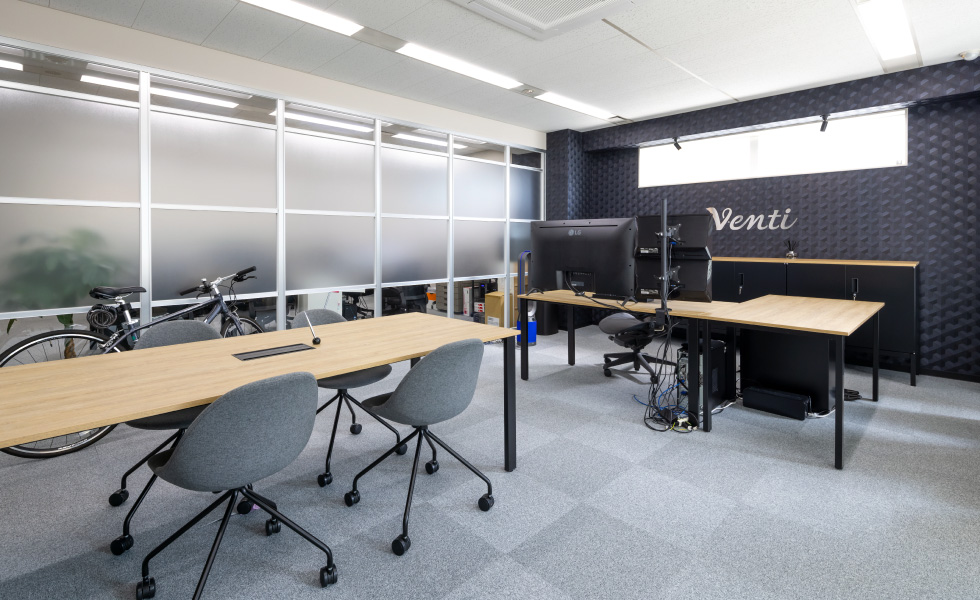 「シンプルで洗練された高級感のある空間」づくりがテーマ。エントランスはモノトーンを基調に、奥行き感と高級感を出すため、正面の壁にはブラックガラスを、サインにはスチールを採用しました。カウンターを大きく箱型にすることで、重厚感を与えつつ大容量の収納も確保しています。ワークスペースは、固定席に加え、将来の人員増加も踏まえてフリーアドレスに。広々とした会議室は、壁面をブラックにすることで空間を引き締めつつ、お客様も招く場所であることから高級感のある家具をセレクトしました。社長室は、木目とブラックを基調とした家具でコーディネートし、ダークトーンの壁面や、陰影のある壁紙、そしてサインを施工。自席でWEBミーティングを行う際にも映える背景になるよう工夫しました。