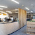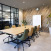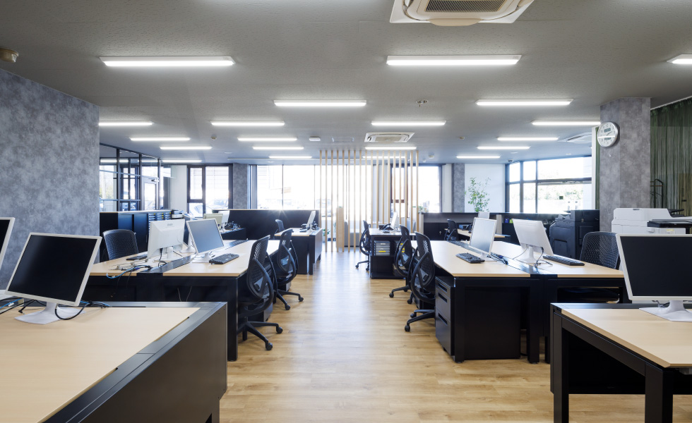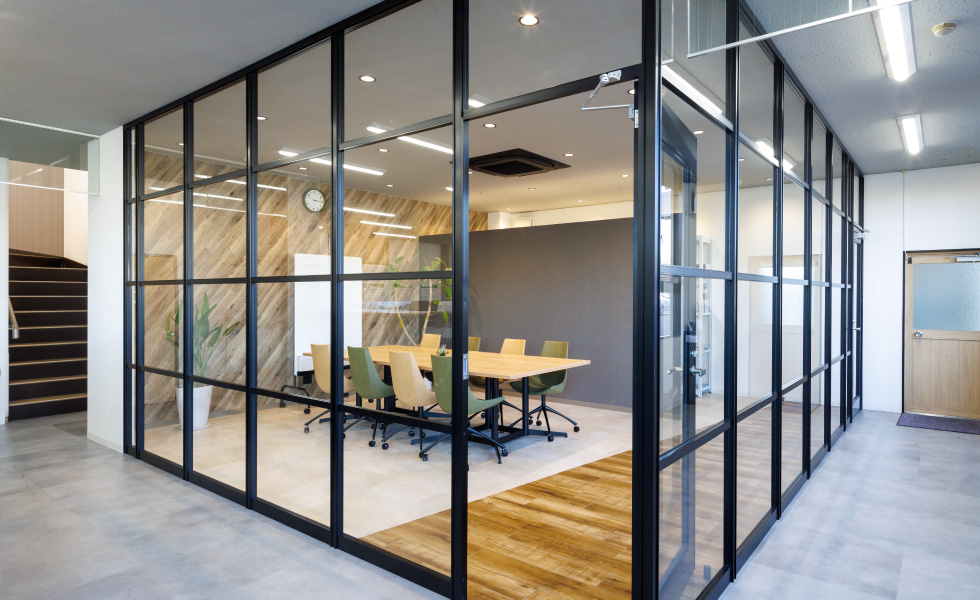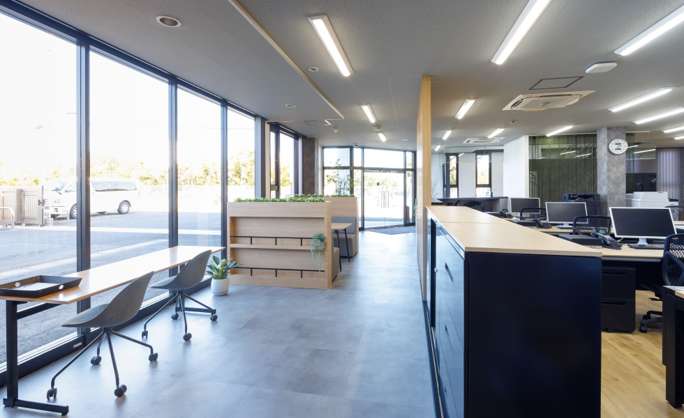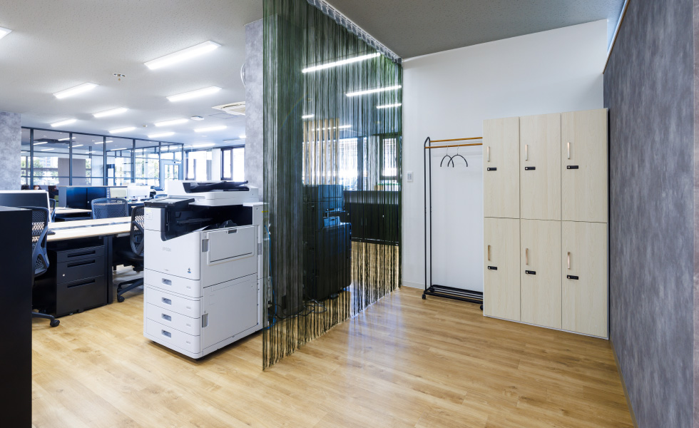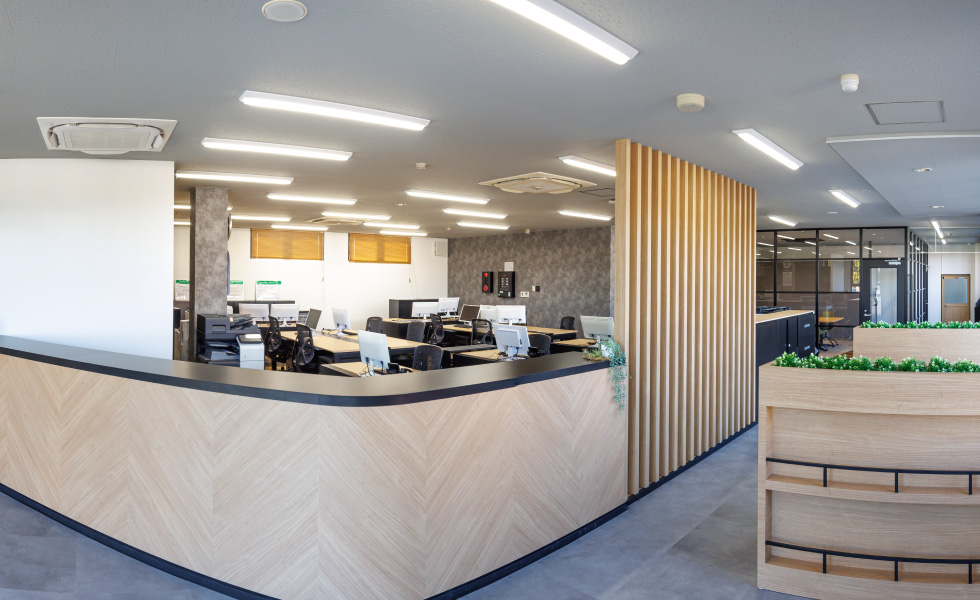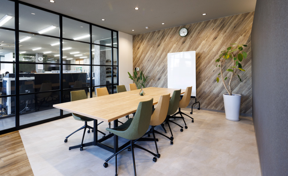 お客様がオフィスに来られた際、真っ先に目に入る位置の席が背を向けた状態にならない配置にするなど、そこで働く社員のみなさんだけでなく、外部の方々にとっても心地よい空間づくりをめざしました。開放感を保ちながら空間を区切ることができるよう、ルーバー壁やガラスパーテーションを採用しつつ、モノトーンと木目を基調とした落ち着きのある雰囲気を重視。シンプルながらも、ルーバー壁・ブラインド・フリンジカーテンによる縦のライン、アクセント壁や床の切り替えによる斜めのラインなど、変化を持たせたデザインを心がけました。